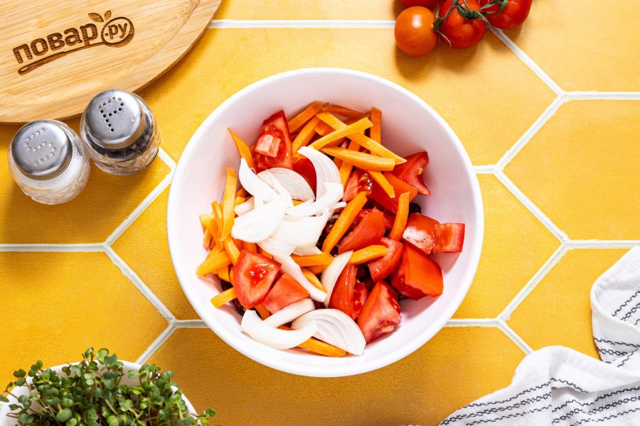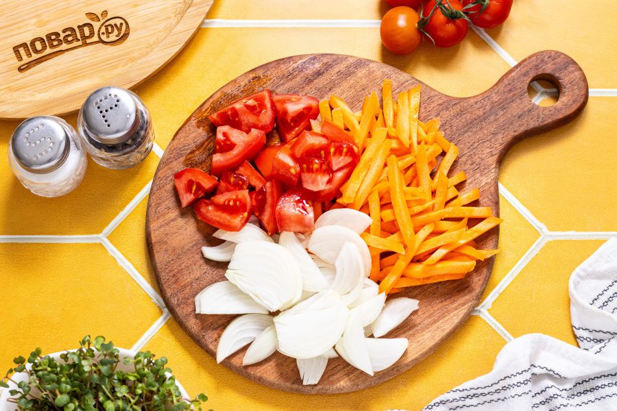 Морковь нарежьте брусочками. Репчатый лук нарежьте полукольцами. Помидоры нарежьте крупными кубиками.