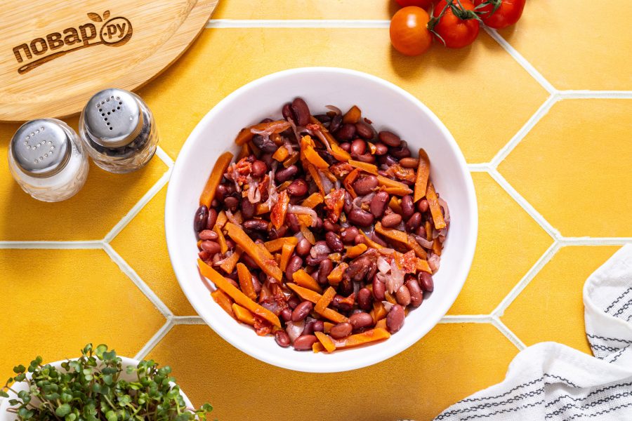 После достаньте фасоль, посолите и поперчите. Готовьте на средней мощности еще 20-25 минут до мягкости фасоли.