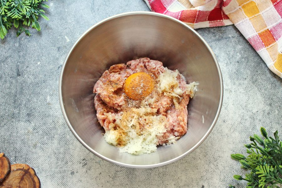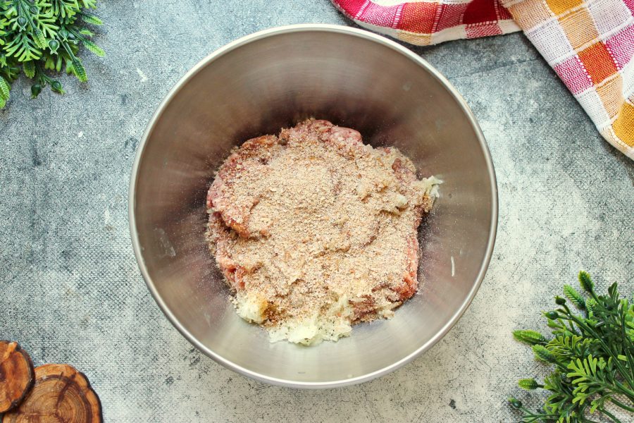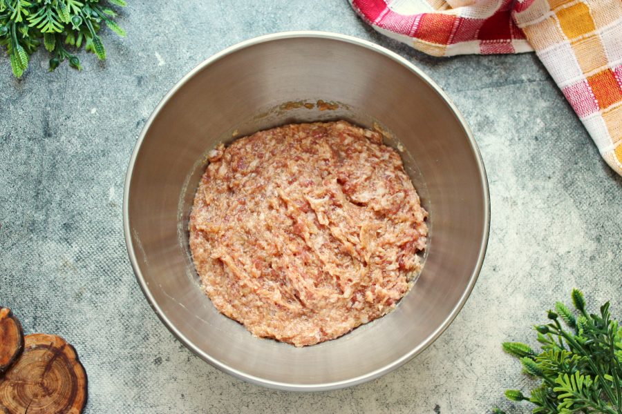 Все хорошо перемешайте, накройте крышкой и оставьте фарш в прохладном месте на 15 минут. Отбейте готовый фарш до плотности. Для этого соберите фарш в руку, поднимите над миской и бросьте обратно. Сделайте так 10-15 раз до плотного состояния.