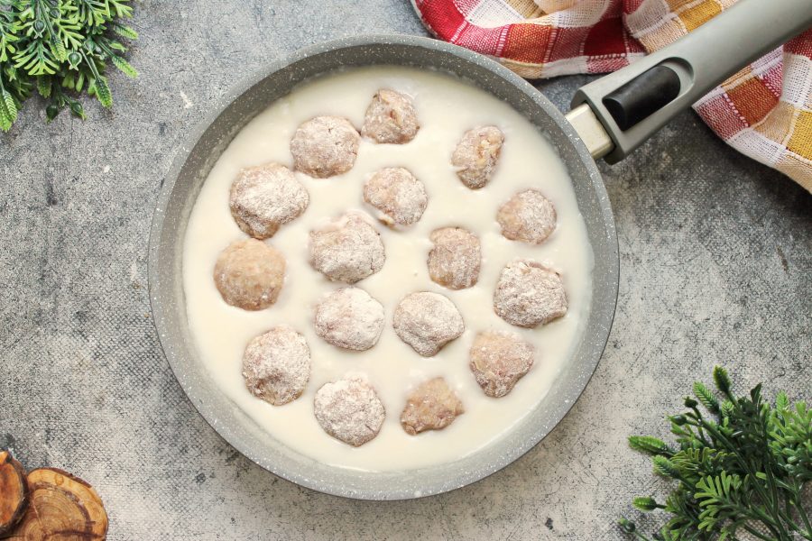 Мокрыми руками сформируйте фрикадельки и полностью запанируйте их в муке. Муки может понадобиться больше или меньше, это будет зависеть от муки и размера фрикаделек. Выложите фрикадельки в сковороду с соусом.