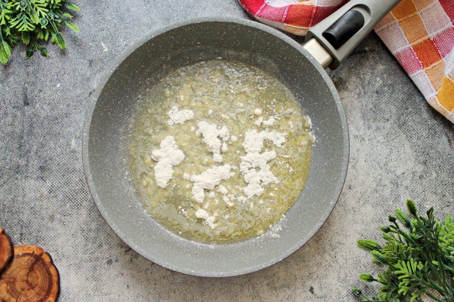 Для соуса выложите в сковороду сливочное масло и влейте растительное масло, разогрейте. Всыпьте в сковороду муку, перемешайте.
