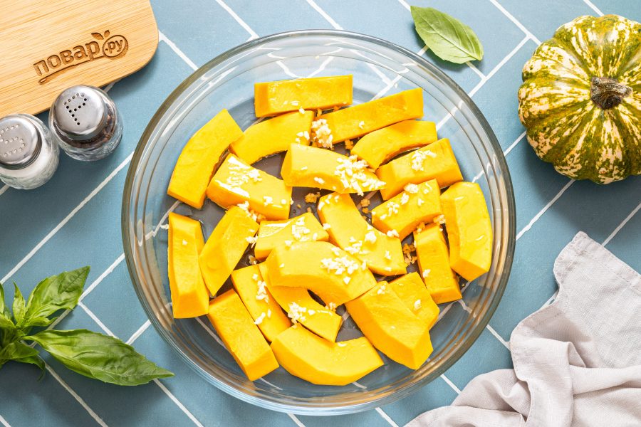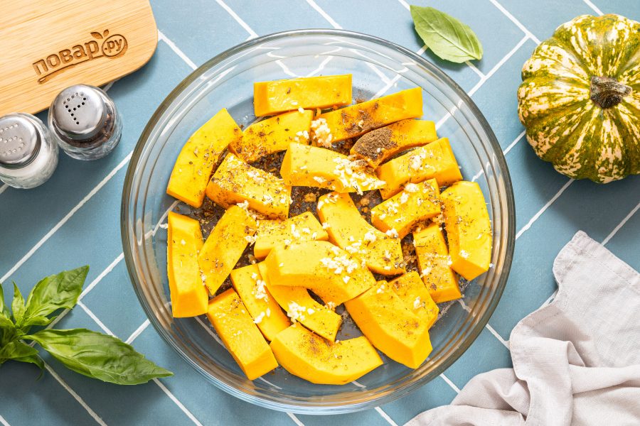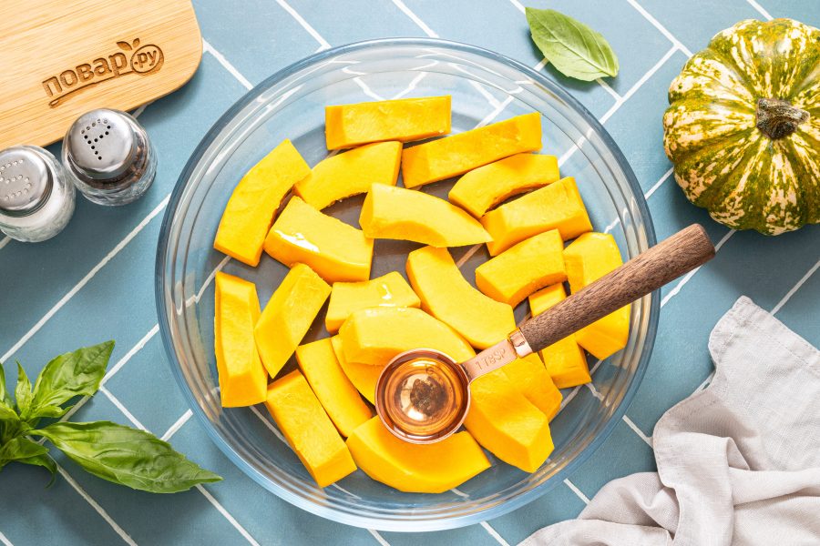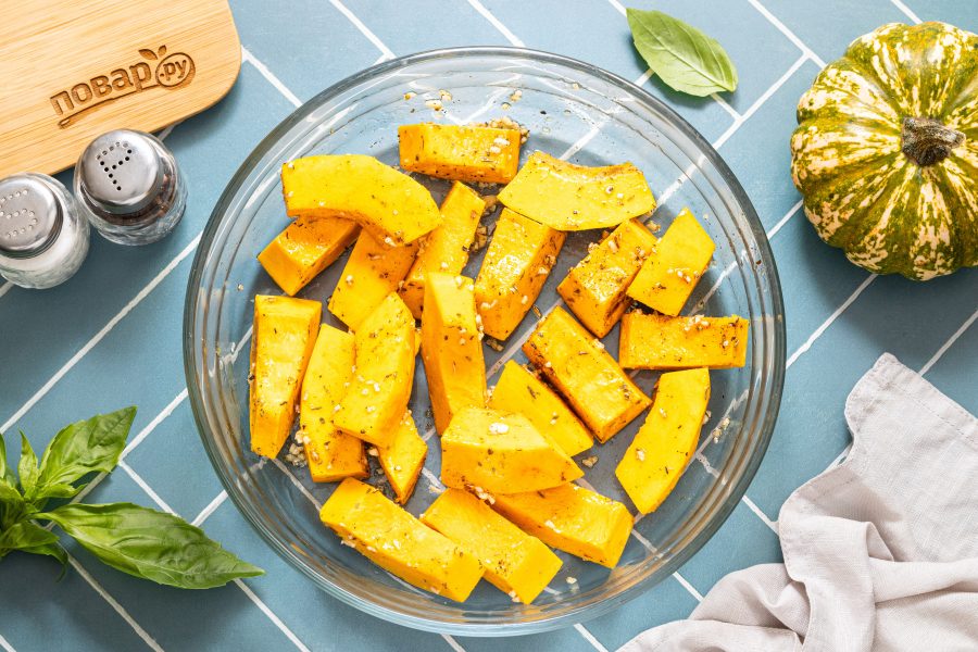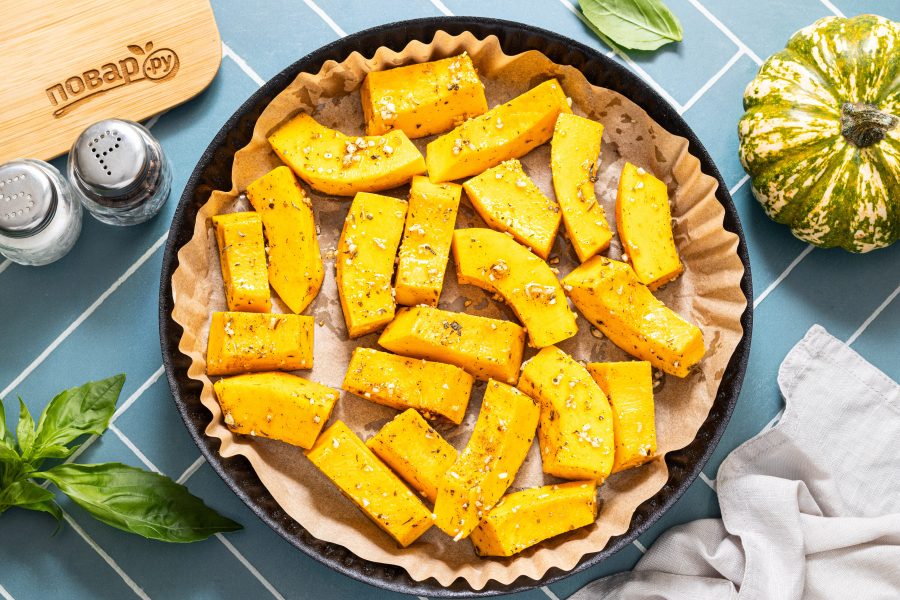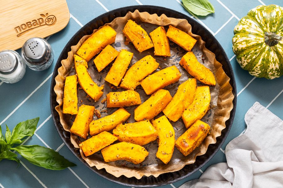 Выложите тыквенные ломтики в форму для запекания. Выпекайте в разогретой до 185 градусов духовке около 30-40 минут до мягкости и румяного цвета. В готовую тыкву должно легко входить вилка.