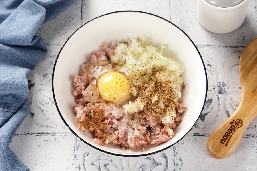 Фарш переложите в глубокую миску. Добавьте тёртый на крупной тёрке лук, давленый чеснок, одно небольшое яйцо, соль и специи по вкусу.
