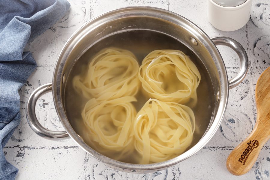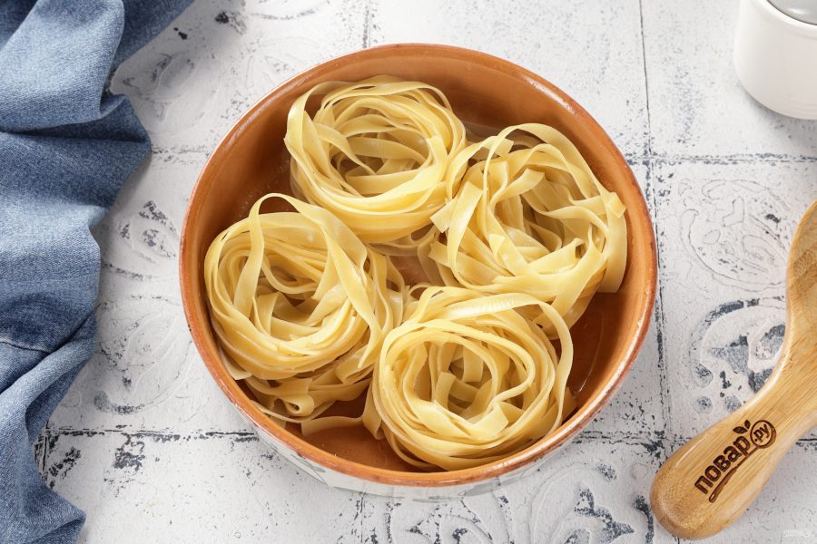 Гнёзда из макарон опустите в кипящую подсоленную воду, буквально на 1-1,5 минуты. Они должны стать мягкие и эластичные, но продолжать держать форму. Вода должна покрывать гнёзда, не более, чем на 2-3 см. Достаньте аккуратно гнёзда шумовкой и переложите на дуршлаг, чтобы стекла вода.