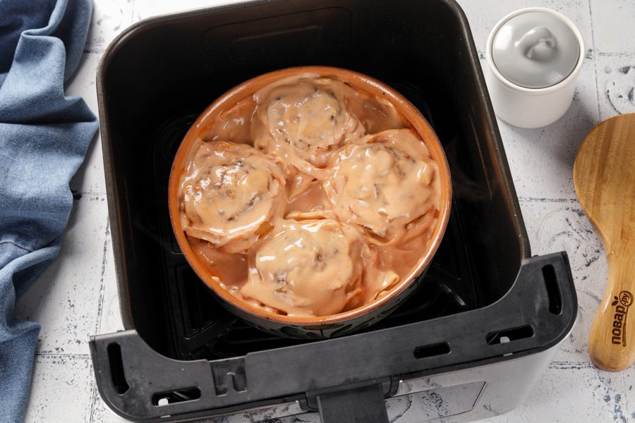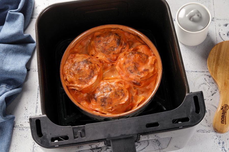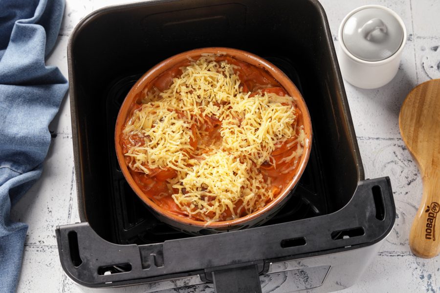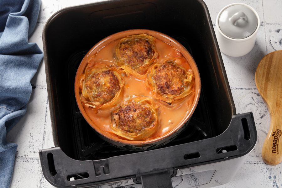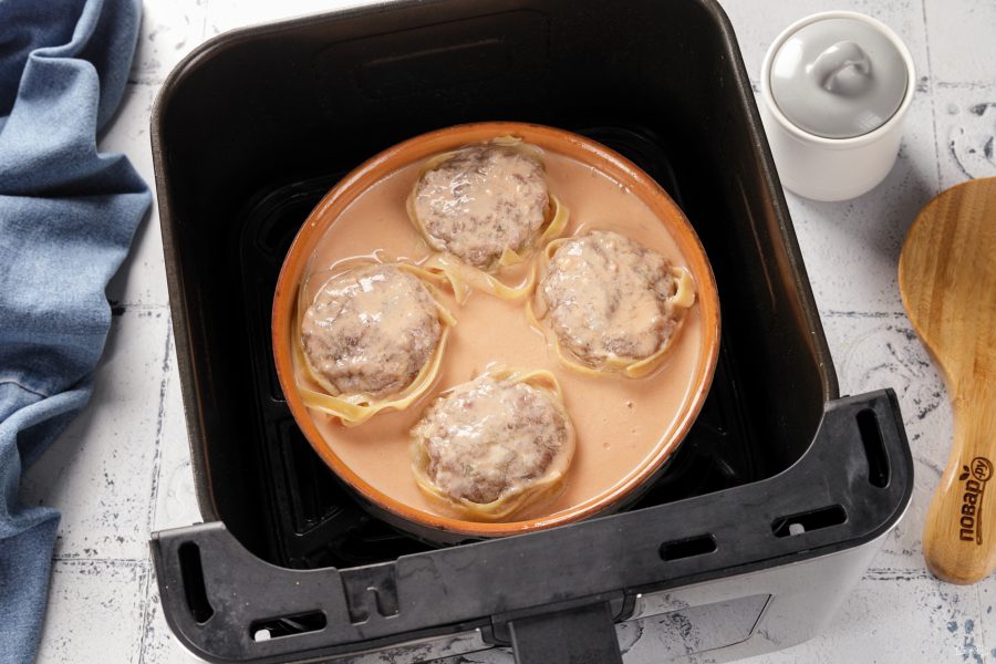 Переложите гнёзда в подходящую глубокую посуду для аэрогриля. Можно использовать одноразовые формы из фольги.