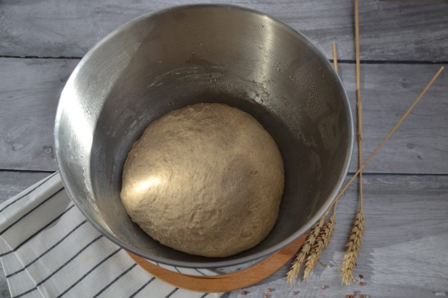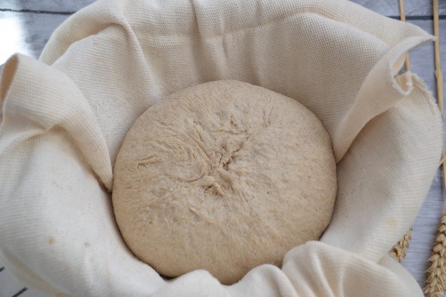 Выложите заготовку хлеба в форму для расстойки швом вверх. Это можно сделать в обычной миске, накрытой салфеткой, присыпанной мукой. Прикройте тесто сверху салфеткой или пленкой от пересыхания. Оставьте для подъема на 1,5 часа.