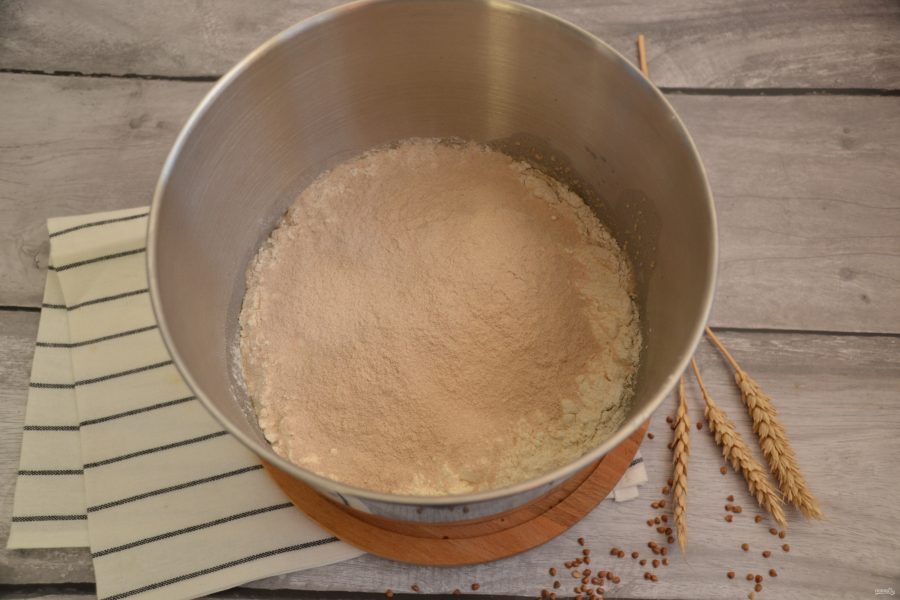 Добавьте сухие ингредиенты (всю муку, соль). Вручную или с помощью миксера замесите тесто. Тесто достаточно плотное, так и должно быть, дополнительно воду не добавлять.