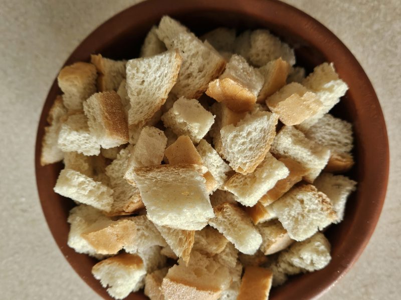 Переложите нарезанный хлеб в отдельную емкость и полейте его нашей смесью из масла, чеснока, зелени и перца. Тщательно перемешайте хлеб, чтобы каждый кусочек пропитался ароматной заправкой.