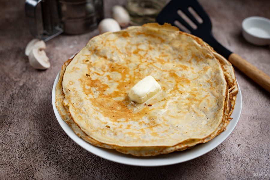 Горячие блины выкладывайте на плоскую тарелку стопкой, каждый блин смазывая при