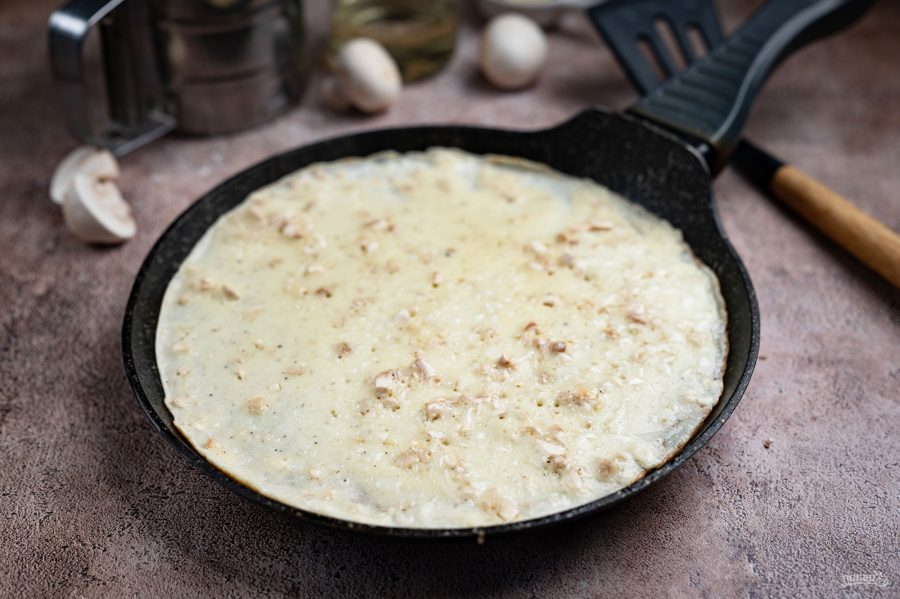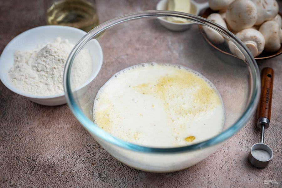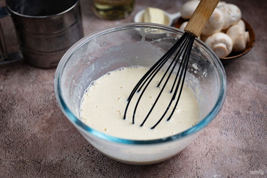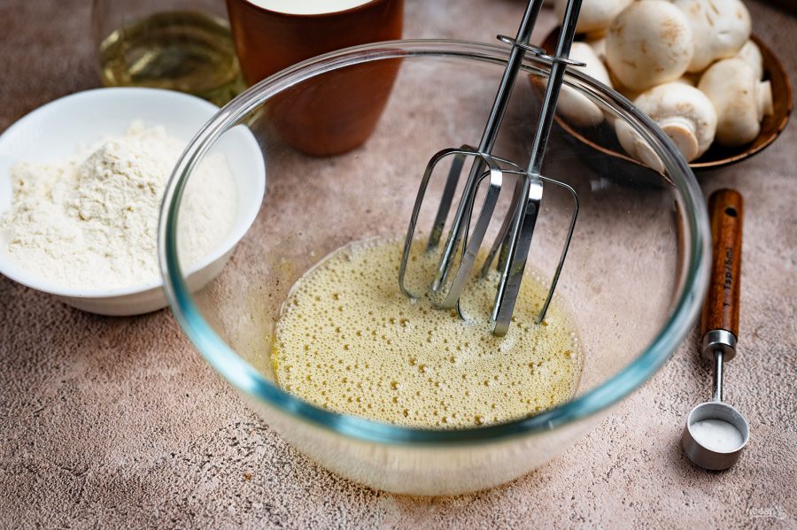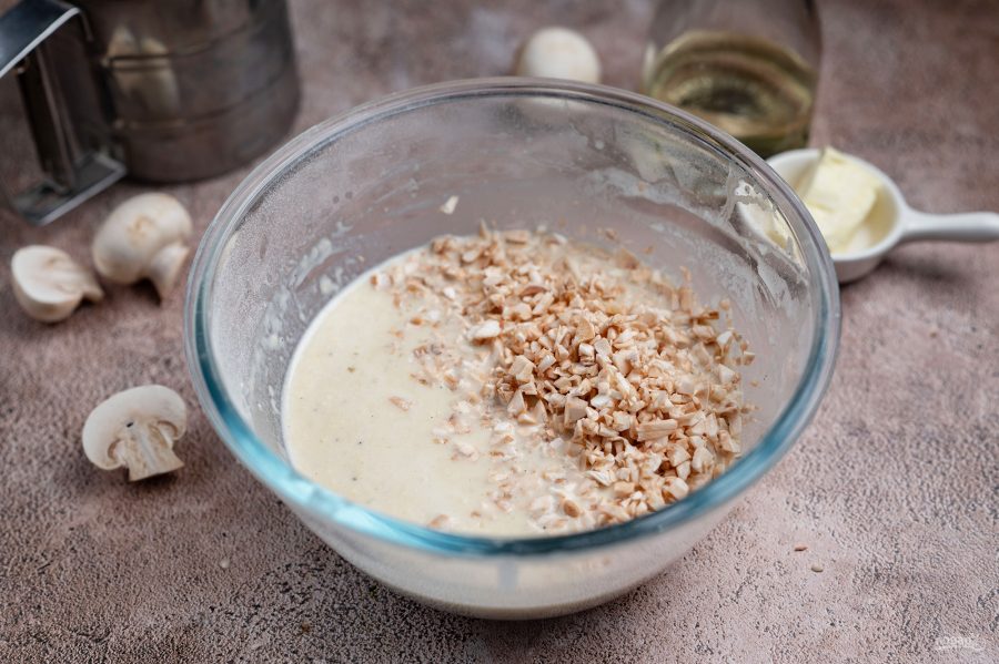 Добавьте мелко нарезанные шампиньоны в блинное тесто. Перемешайте все венчиком.
