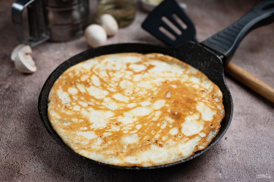 формируя тонкий блинчик. Обжаривайте примерно 2 минуты с одной стороны до