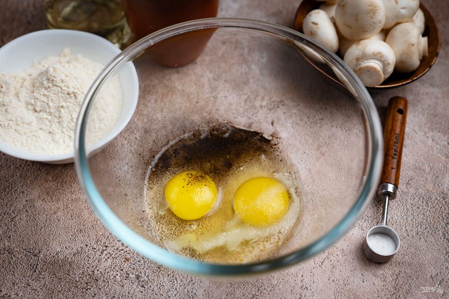 В удобную миску вбейте яйца и добавьте к ним черный молотый перец и соль.