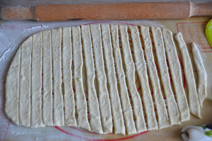Раскатайте одну часть теста в пласт, нарежьте на полоски. Скатайте полоски в жгутики.