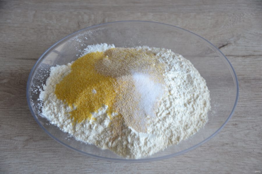 Смешайте все сухие ингредиенты: муку, кукурузную поленту "Bravolli", соль, сухие дрожжи.