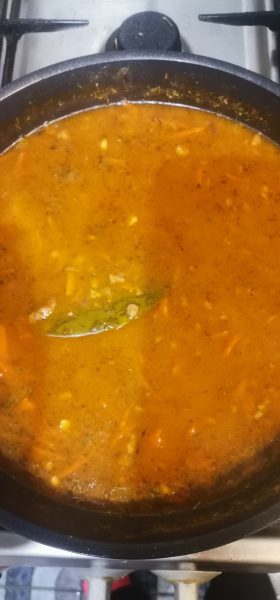 А теперь начинаем вливать воду небольшими порциями, при этом тщательно размешиваем содержимое сковородки. Количество воды регулируем сами. Оно зависит от того, какой густоты подливку вы хотите получить в итоге. Добавляем лавровый лист. Готовим гуляш еще минут 10 после закипания. Можно добавить зелень.