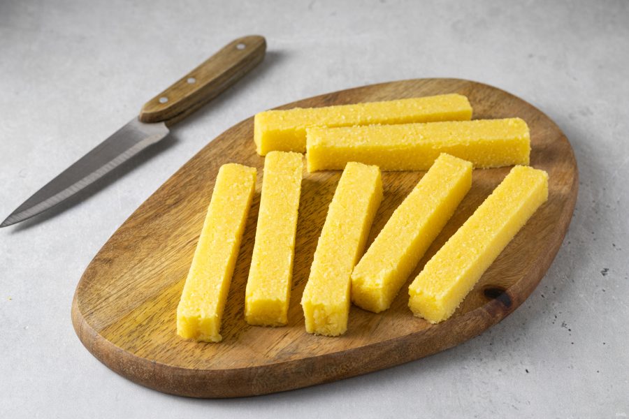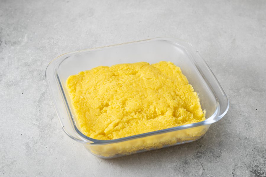 Переложите горячую поленту в прямоугольную форму. Уберите в холодильник на 1-2 часа, чтобы она полностью застыла.