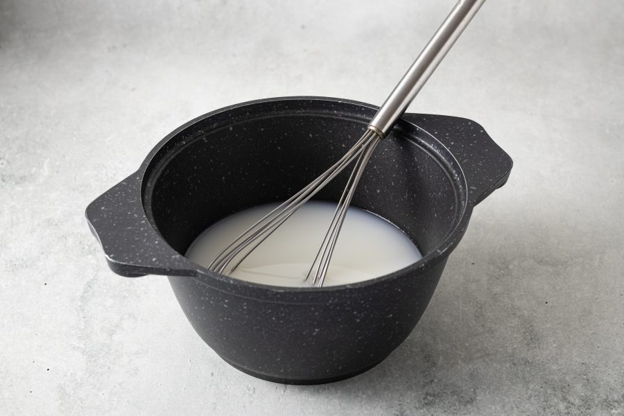 Смешайте в кастрюле с толстым дном молоко и воду. Добавьте щепотку соли и доведите смесь до кипения.