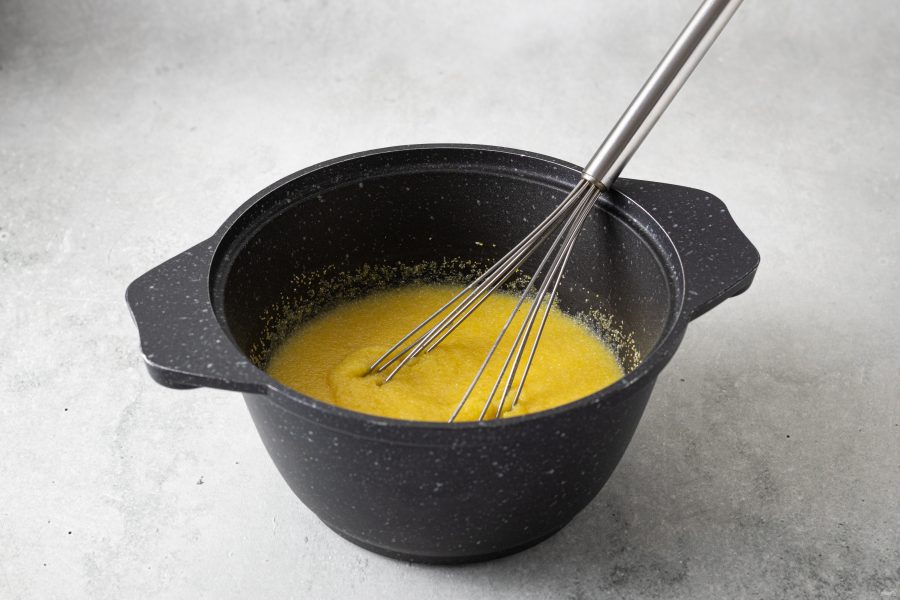 Введите тонкой струйкой поленту, одновременно помешивая смесь венчиком, чтобы не оставалось комочков. Варите на медленном огне 5-6 минут.