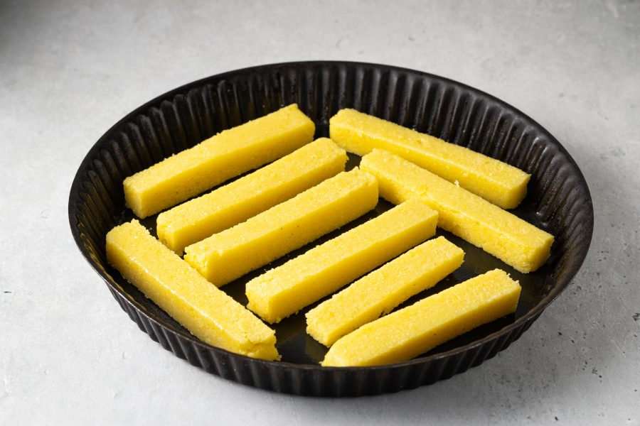 Смажьте форму для выпечки растительным маслом. Выложите в один слой палочки из поленты. Смажьте их тоже слегка маслом и запекайте 15 минут в заранее разогретой до 200 градусов духовке. Затем переверните и пеките еще 15 минут.