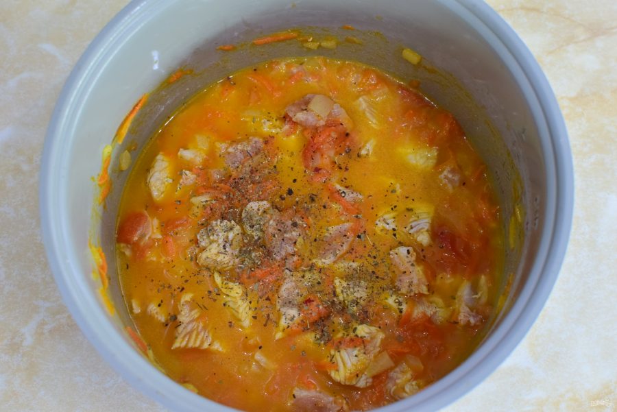 Влейте в чашу кипяток. По вкусу добавьте соль и специи. Если хотите больше получить подливы, то воды можно добавить больше. Закройте крышку. Поверните клапан. Включите режим "Запекание" на 20-25 минут.