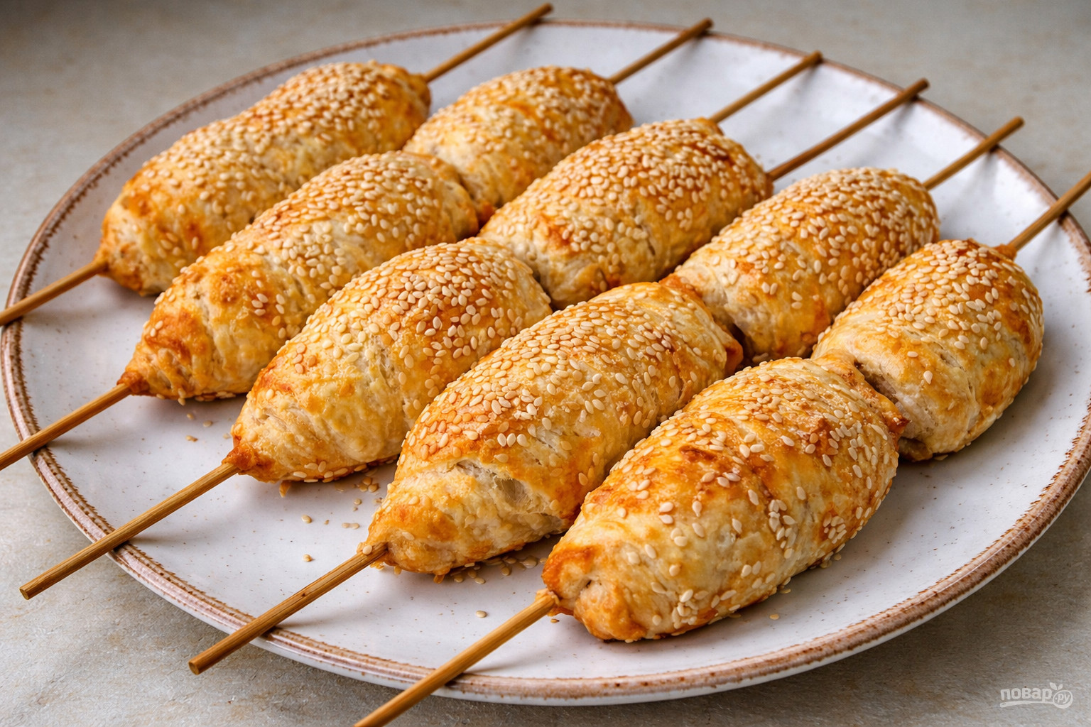 Теперь смазываем противень растительным маслом, раскладываем на нём шпажки. Отправляем в духовку и запекаем до золотой корочки.
