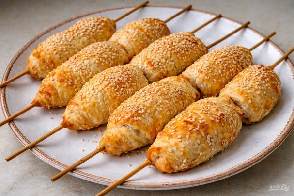Слоеное тесто разрезаем на полоски и раскатываем потоньше. Дальше аккуратно обматываем шпажки с начинкой полосками теста. Старайтесь тщательно замотать, чтобы не осталось пробелов, в противном случае сыр может вытечь.