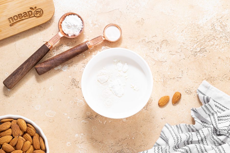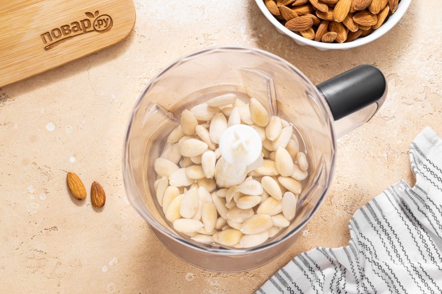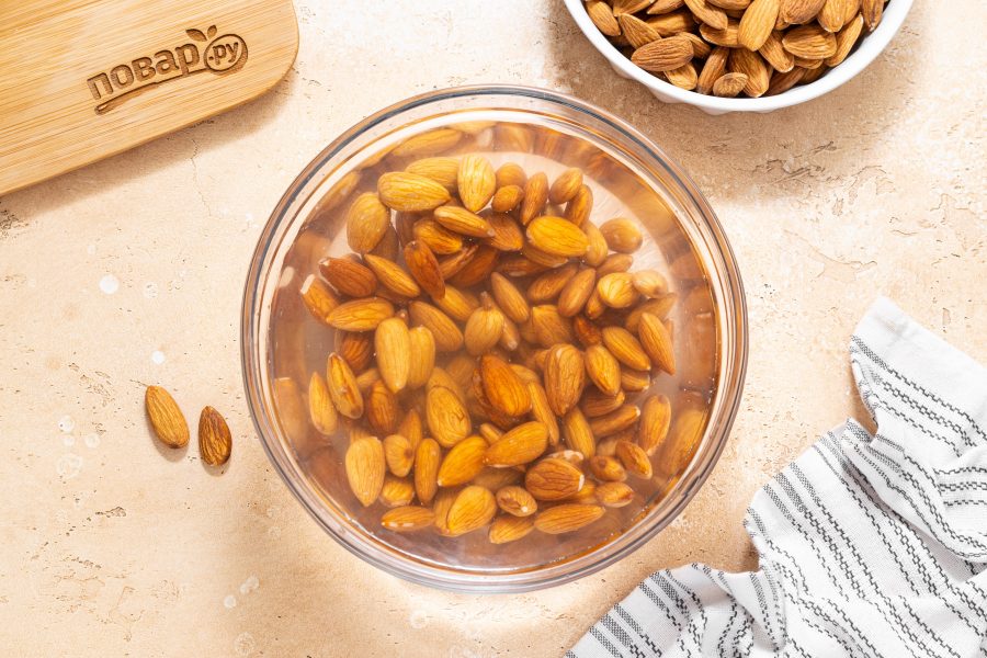 В начале нужно будет приготовить миндальное молоко. Миндаль замочите в воде на ночь. Если нет времени, можно замочить орехи в горячей воде на 1 час.