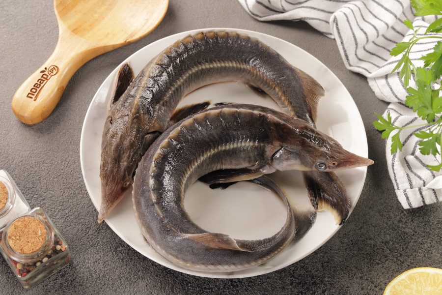 Стерлядь потрошите аккуратно, у неё хребёт "опасный" и лучше срезать его ножницами. Отрежьте голову, хвост и плавники у рыбы.
