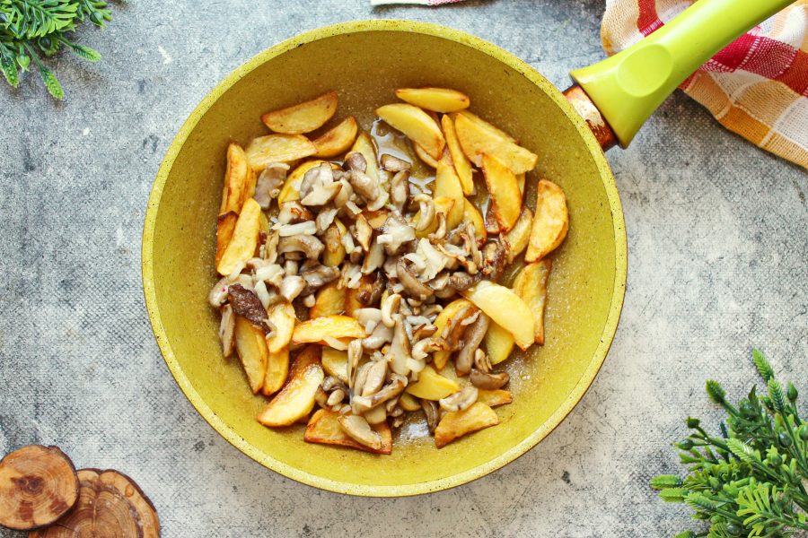 Пока жарятся маслята, на другой сковороде приготовьте картошку. В другую сковороду налейте оставшееся масло и разогрейте на среднем огне. Картофель порежьте дольками и выложите в сковороду, обжаривайте до готовности и румяной корочки. На это уйдет примерно 7-10 минут.