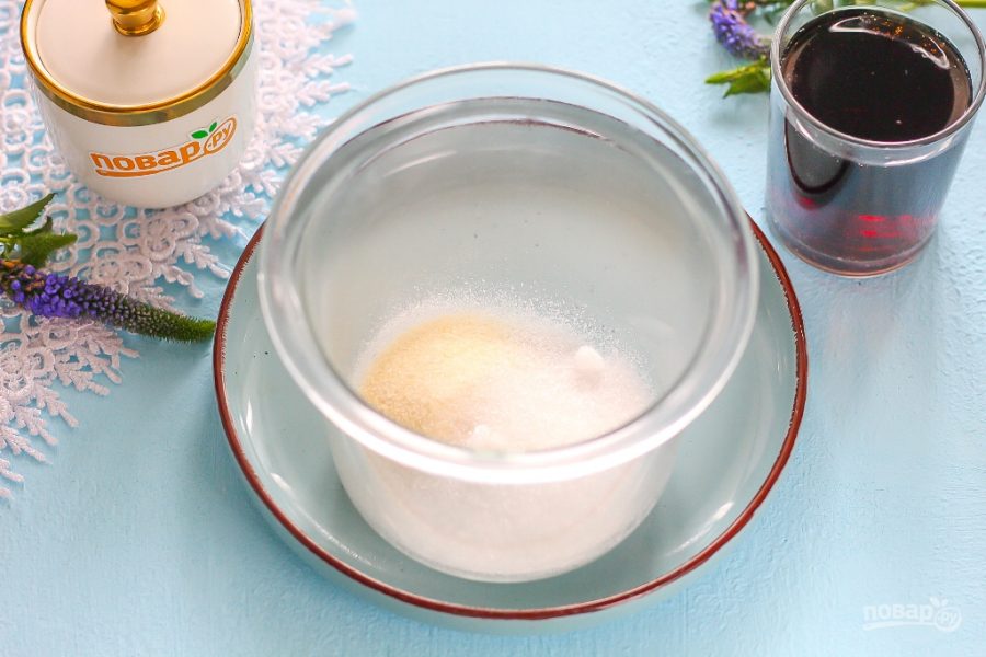 Всыпьте сахарный песок и желатин в глубокую емкость: миску либо салатник, глубокую пиалу. На этом этапе можно добавить пару щепоток ванильного сахара или лимонной кислоты.