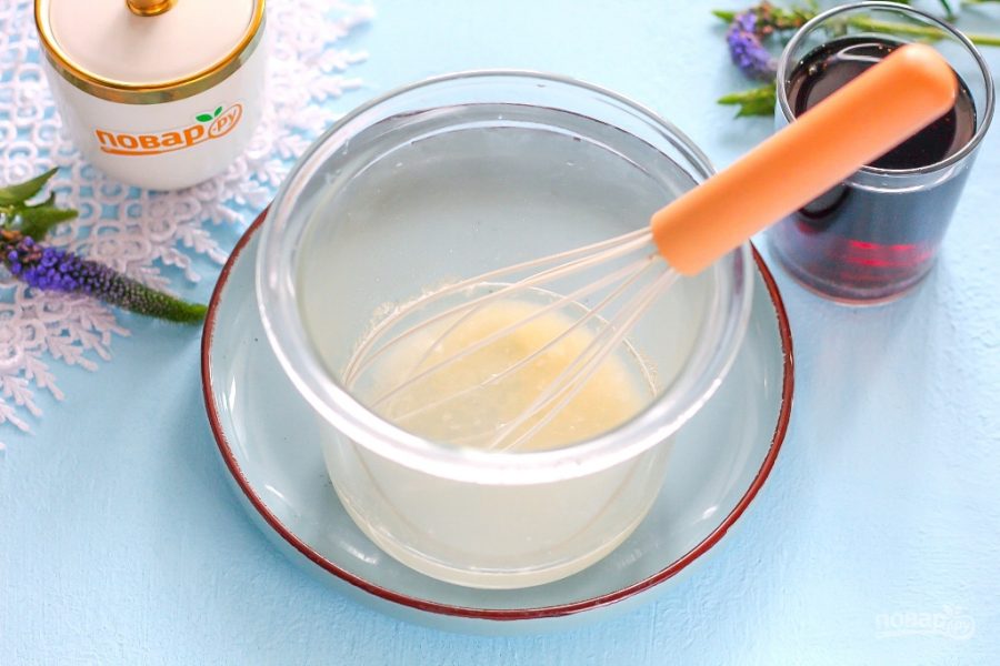 Влейте кипяток в емкость и сразу же перемешайте все венчиком. Оставьте на 5-10 минут, чтобы гранулы желатина набухли и снова перемешайте до полного растворения гранул. Обязательно проводите венчиком по дну емкости и стенкам — там, где осел желатин.