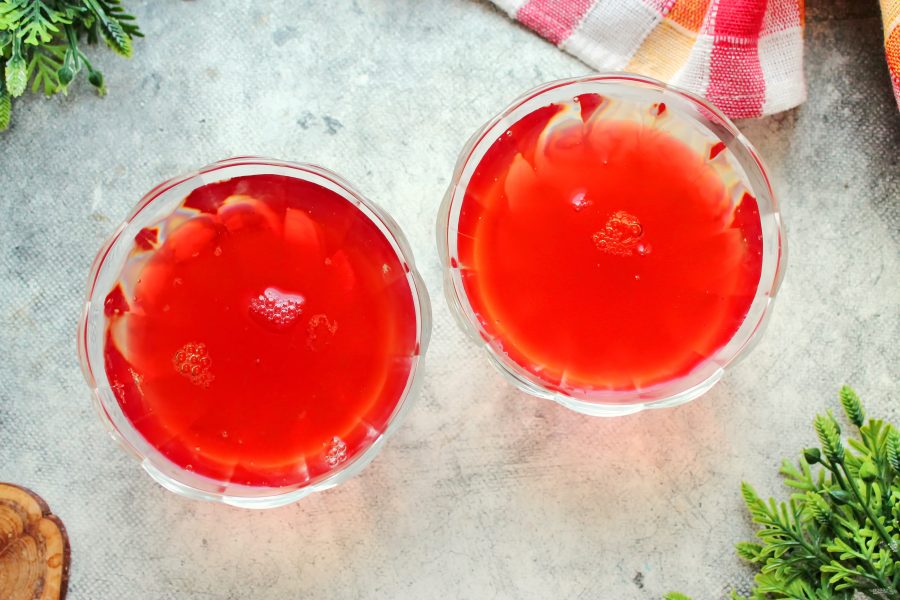 Распустите желатин и сахар любым удобным способом. Разлейте желейную смесь в креманки или бокалы и поставьте в холодное место, примерно на 15-20 минут, чтобы слой схватился и стал плотнее.