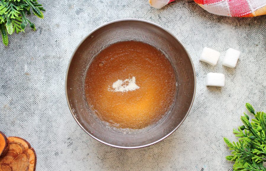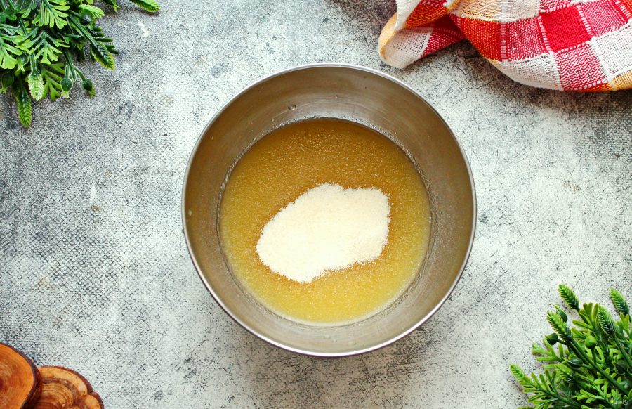 Добавьте в миску сахар, перемешайте и дайте постоять от 40-60 минут, чтобы желатин набух. У меня желатин не требует замачивания, поэтому я этот пункт пропускаю. Но вы готовьте по инструкции именно к своему виду.