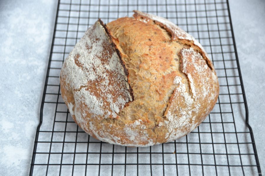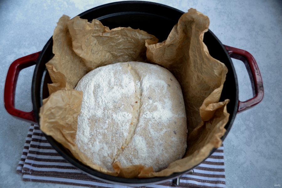 К моменту окончания расстойки разогрейте духовку до 250 граусов вместе с толстостенной кастрюлей, в которой будет выпекаться хлеб.