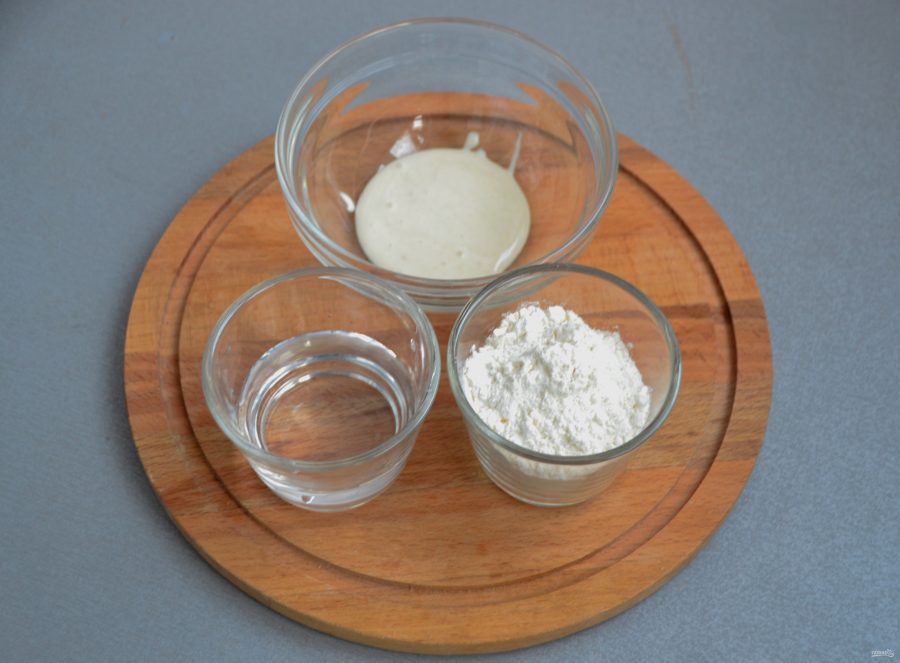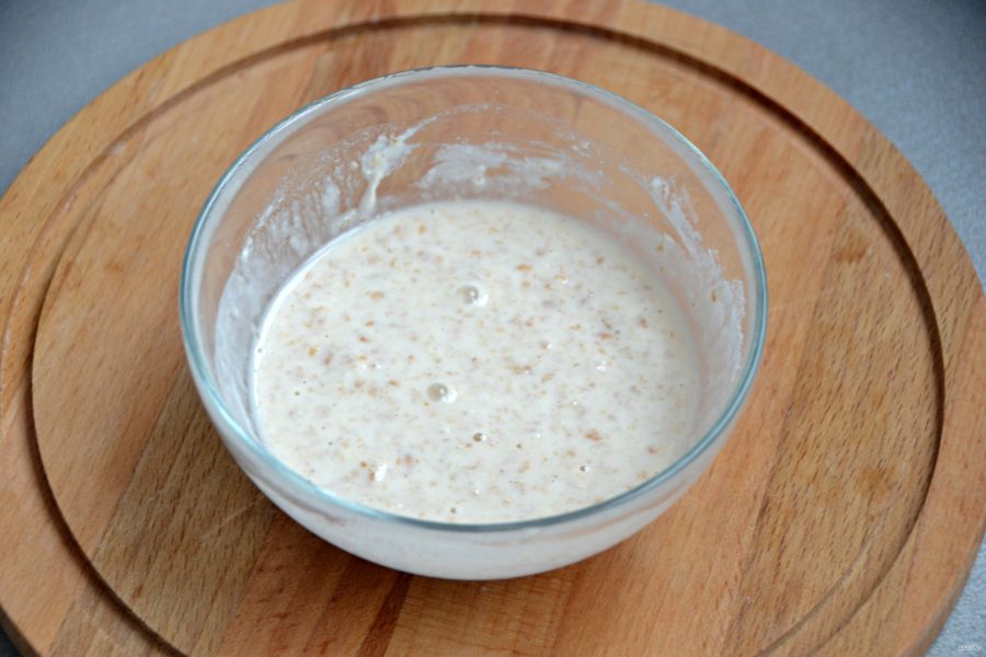 Возьмите 50 грамм полученной зерновой массы, 50 грамм воды и 50 грамм муки с высоким содержанием белка (не ниже 12%). Все смешайте, накройте пищевой пленкой, оставьте при комнатной температуре на сутки.