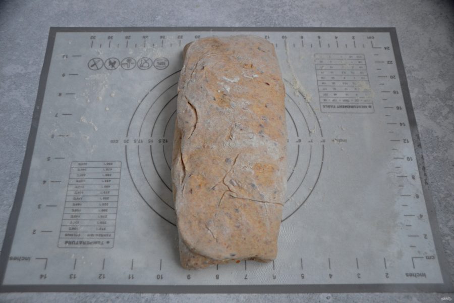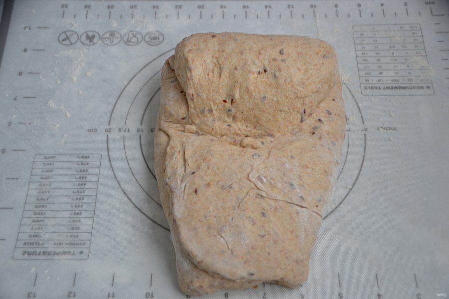 После трех обминок, снова накройте тесто пищевой пленкой и поставьте в холодильник для холодного брожения на 12-16 часов.