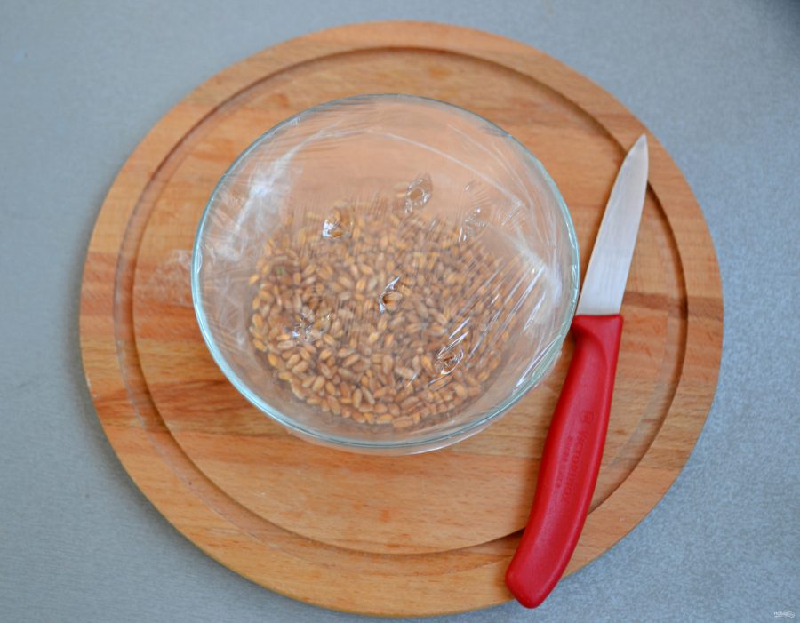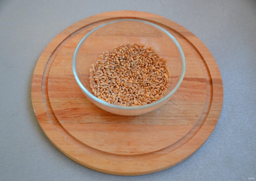 Для приготовления закваски возьмите 50 грамм пшеницы, промойте ее. Залейте водой, уровень воды должен быть выше уровня зерен на 1,5-2 см.