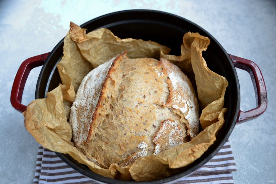 Поместите хлеб вместе с бумагой в горячую кастрюлю, накройте горячей крышкой и поставьте в духовку при температуре 250 градусов на 30 минут.