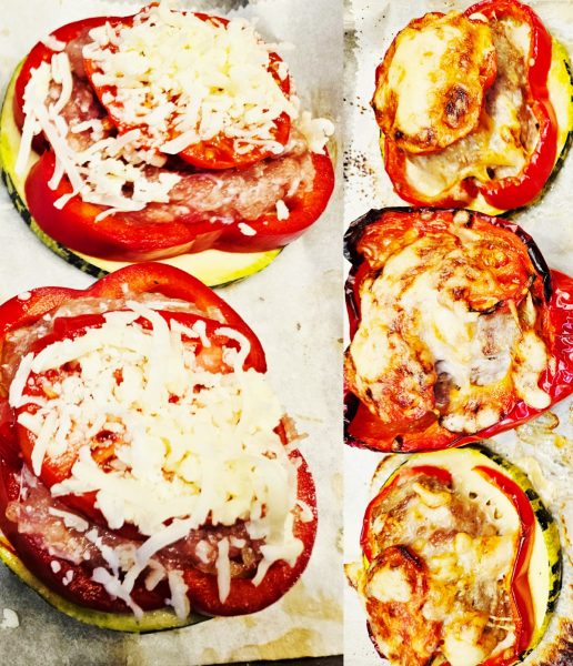 2. Теперь выкладываем кабачки на противень с пекарской бумагой, и заполняем фаршем. Сверху заливаем сметаной, добавим специи по вкусу. Можно добавить тертый сыр.