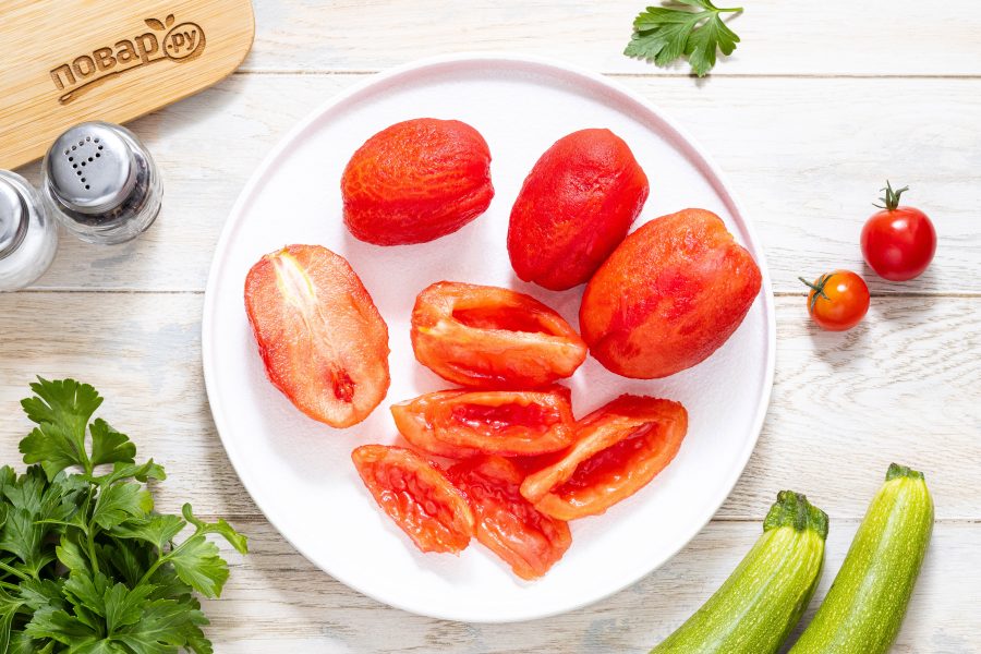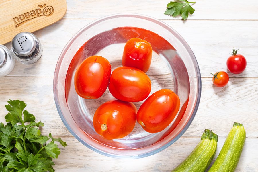 На помидорах сделайте надрез крест-накрест, опустите их в кипяток на пару минут. Затем сполосните холодной водой.