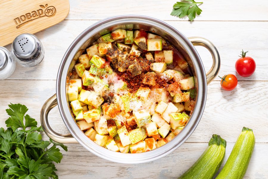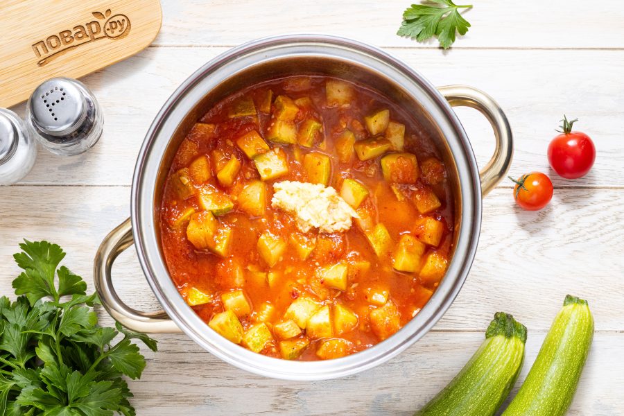Готовьте 20 минут на среднем огне, периодически помешивая. После добавьте мелко порубленный или пропущенный через пресс чеснок, готовьте еще 10 минут. Затем влейте уксус и варите еще 5 минут.