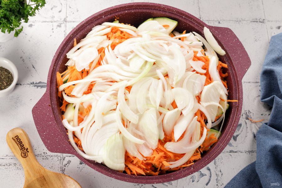 Все овощи необходимо вымыть и очистить. Если у кабачков шкурка нежная, то её можно оставить. Если вы возьмёте кабачок со зрелой шкуркой, то конечно её необходимо будет предварительно очистить. Нарезка произвольная, но не слишком крупно. Для приготовления подойдёт любая глубокая посуда с толстым дном.