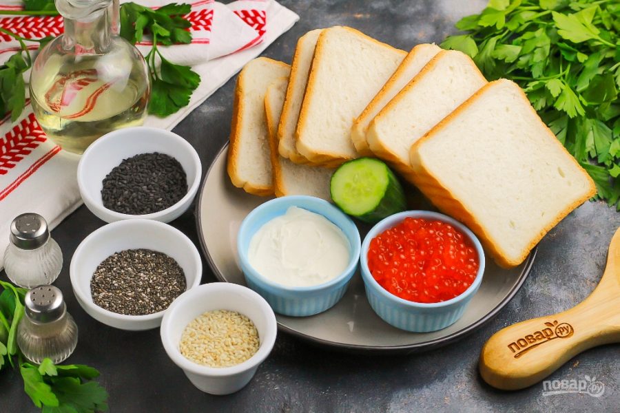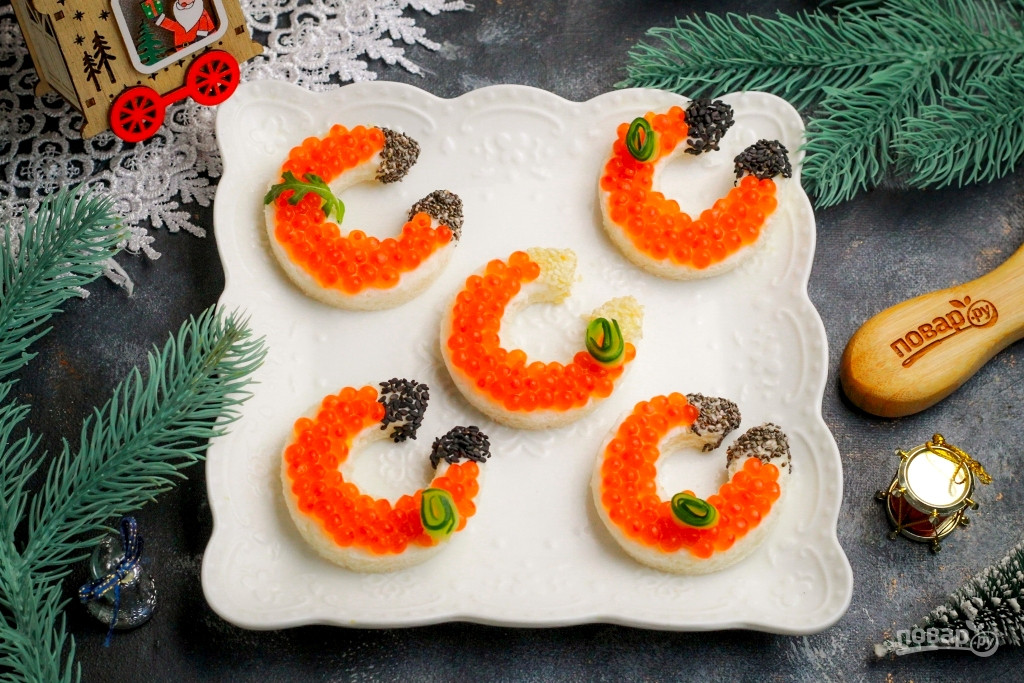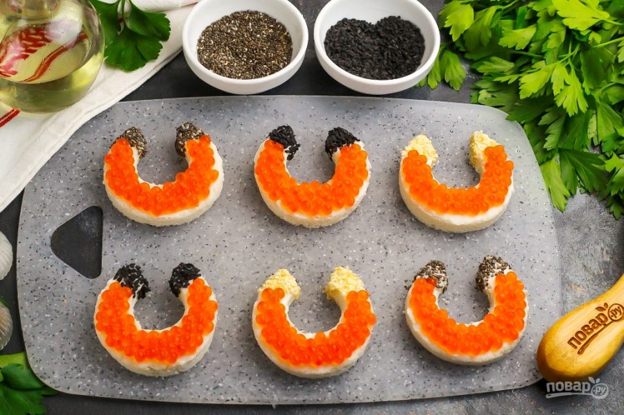 Яркие канапе с красной икрой обязательно привлекут внимание всех гостей. Создайте их в виде подковок, чтобы задобрить символ наступающего Нового года — Лошадь! Создавайте закуску вместе с детьми, они обожают такие уникальные блюда. По желанию вырезанные мякиши можно поджать на растительным масле, если вы любите более хрустящие основы.