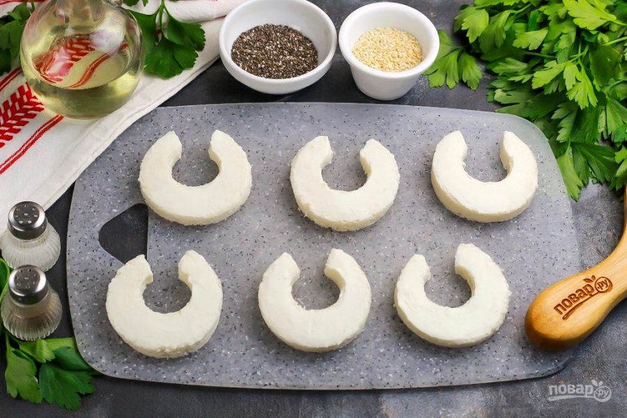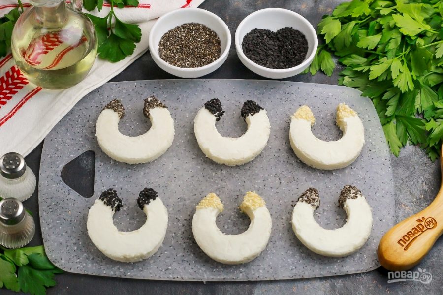 Обмакните кончики некоторых подковок в черный кунжут, другие — в семена чиа, третьи — в белый кунжут.
