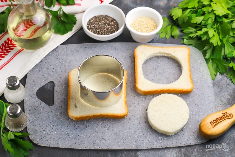Выложите ломтики хлеба на доску или тарелку. Крупным салатным кольцом вырежьте круг именно из мякиша, стараясь не задеть корочки.