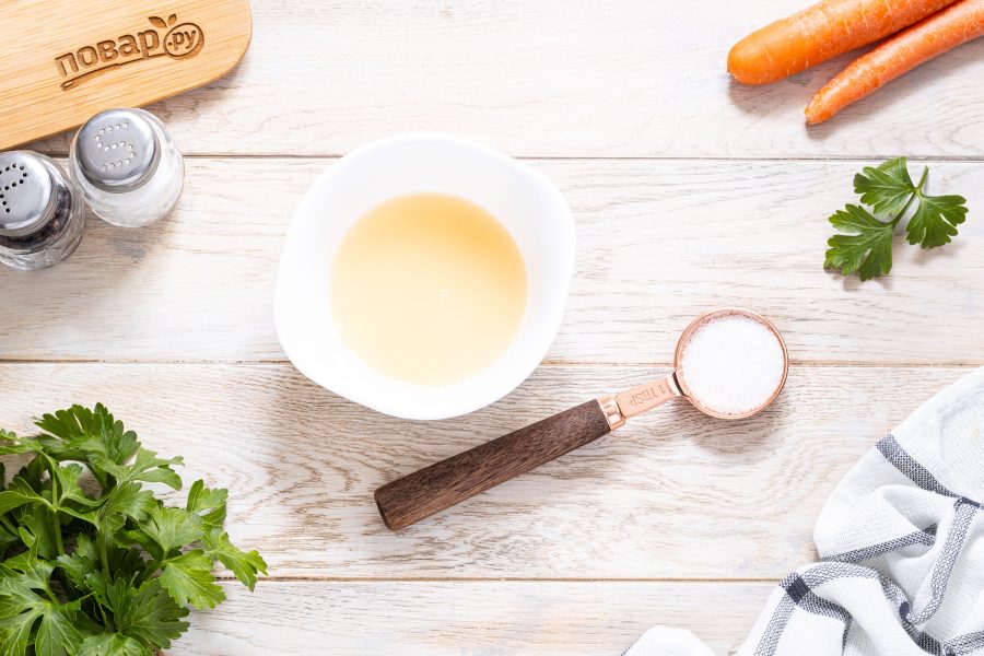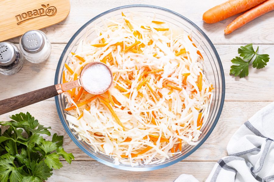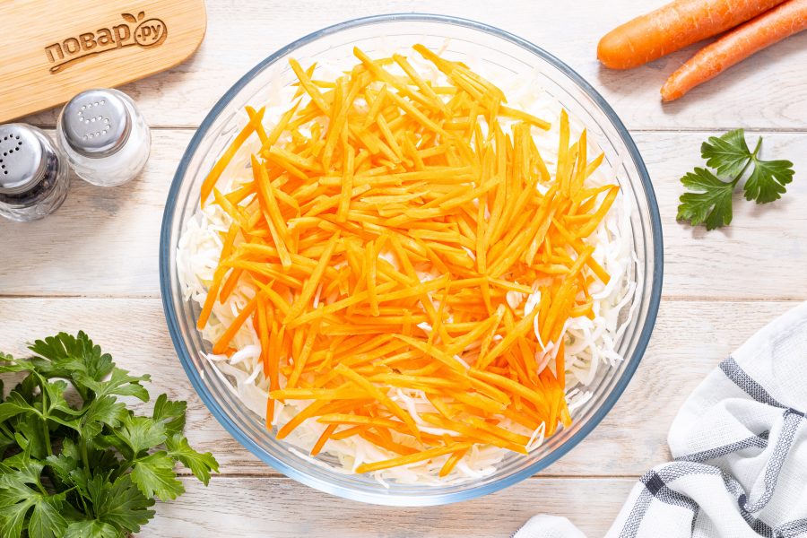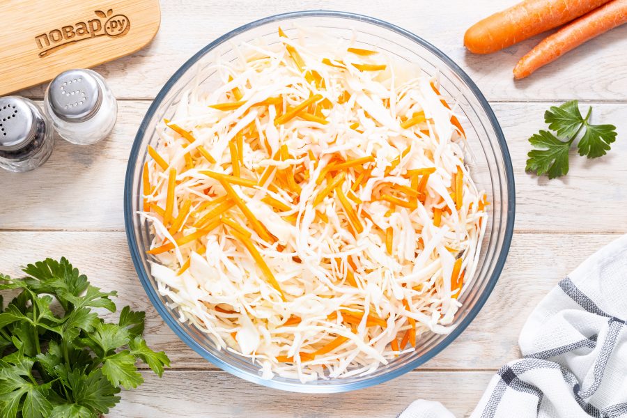 Перемешайте капусту с морковью и немного пожмите руками, чтобы они пустила сок. Оставьте на 10-15 минут.