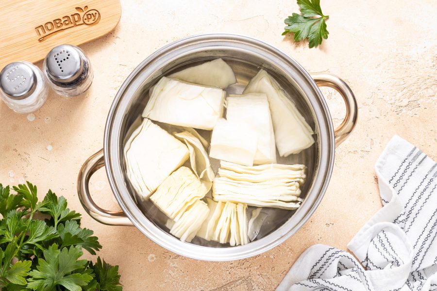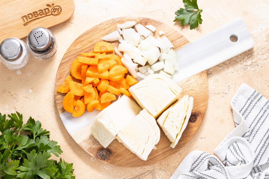 Морковь помойте, очистите и нарежьте кружочками. Репчатый лук нарежьте крупными ломтиками. Капусту разрежьте на кусочки среднего размера.