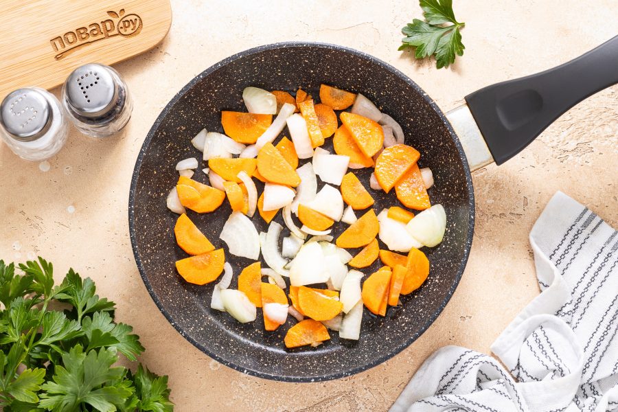 Обжарьте в небольшом количестве растительного масла морковь с репчатым луком до мягкости и золотистого цвета.