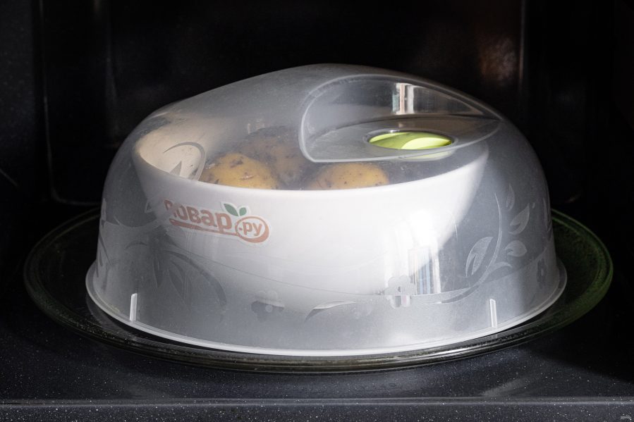 Накройте крышкой или колпаком для микроволновой печи. Готовьте на максимальной мощности (700-900 Вт) около 20 минут.