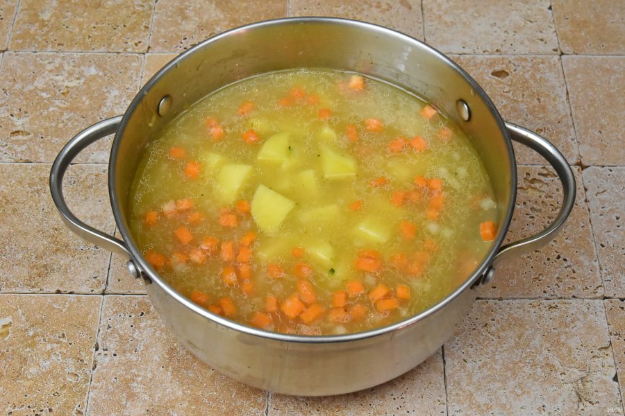 Слегка измельчите суп погружным блендером, чтобы часть овощей пюрировалась и придала супу бархатистую текстуру.